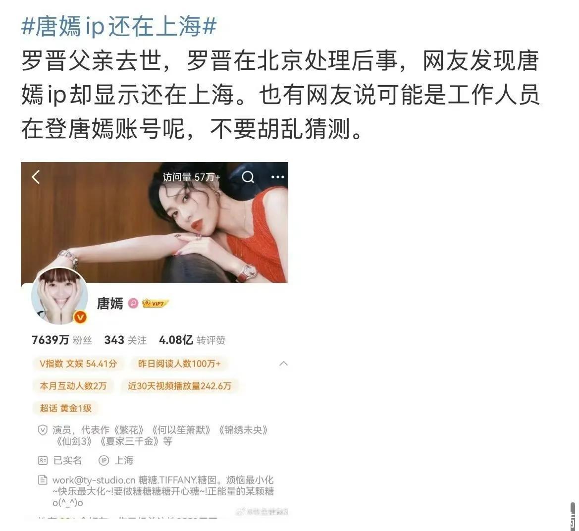 截至发稿,唐嫣IP仍显示上海,