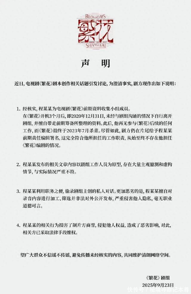 这段录音一出来就炸了锅,但仔细想想,秦雯和陈道明的关系真这么一般?要知道2007年陈道明当《我们无处安放的青春》监制兼主演时,主动拉秦雯这些年轻编剧进组,那可是秦雯第一部有署名的电视剧,她后来还多次叫陈道明“校长”,之后《我的前半生》《流金岁月》,秦雯也都找陈道明演重要角色。这么看来,录音里的话是真吐槽,还是朋友间的随口闲聊? 更让人疑惑的是,“古二”为啥要放这段录音?原来早在之前,他就控诉《繁花》剥夺自己的编剧署名权,这次放录音似乎是想“锤”剧组。可剧组23号发声明直接否认,说“古二”本名叫程某某,只是前期资料收集小组成员,2020年12月31号没打招呼就离开剧组,还擅自带走筹备资料,之后根本没参与过《繁花》的任何工作。剧组甚至说,2023年7月杀青时,已经在片尾给了他“前期责任编辑”的署名,完全符合他的工作内容,从头到尾就没让他当编剧的事。 现在“古二”的微信公众号“古二新语”已经因为违反规定被停用,可这事还没结束。一边是前工作人员控诉署名被抢,一边是剧组说给的署名没问题还谴责偷录隐私,到底谁在说真话?录音里秦雯对陈道明的评价,又是不是另有隐情?